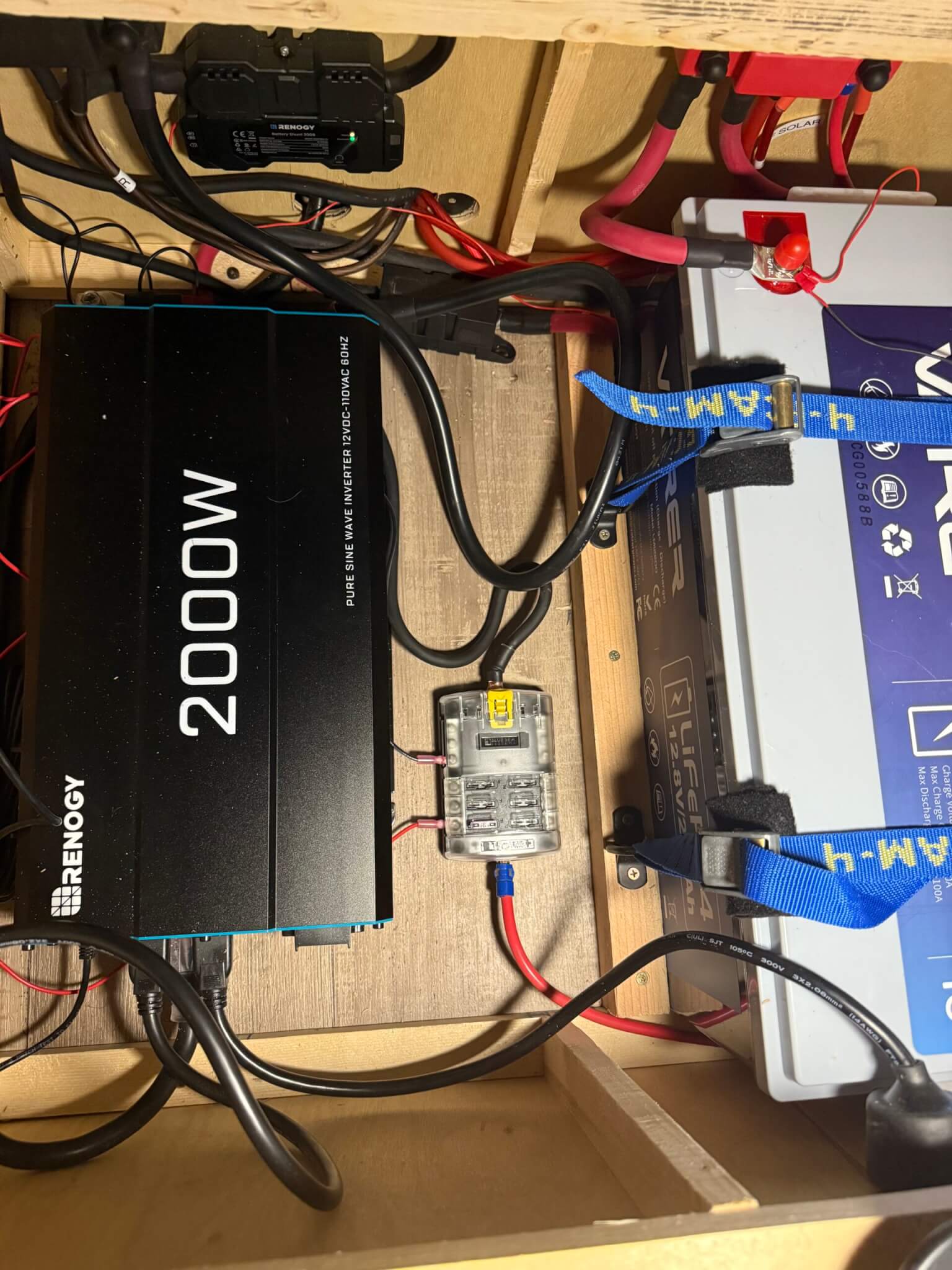 Sticking with Renogy products we added a 2000 watt inverter with remote switch, 2 single outlets and a USB A/C panel to charge our phones and tablets.