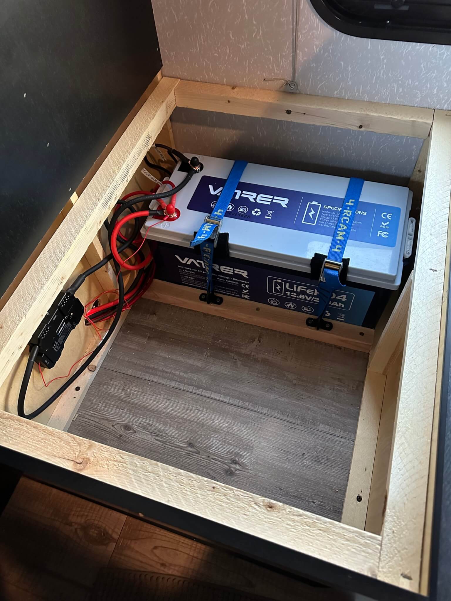 Battery, shunt, and bus bars installed underneath one of the dinette seats. We lose a little bit of storage but gain easy access to everything.